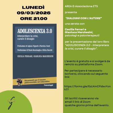 Per il ciclo di “Dialoghi con l’autore”, Area G Associazione ETS propone per lunedì 9 marzo 2026 alle ore 21.00 una serata con Cecilia Ferrari e Gianluca Marchesini, psicologi e psicoterapeuti presso la S.C.NPIA della ASST Grande Ospedale Metropolitano Niguarda, per la presentazione del loro libro “ADOLESCENZA 3.0. Interpretare la crisi, curare il disagio”